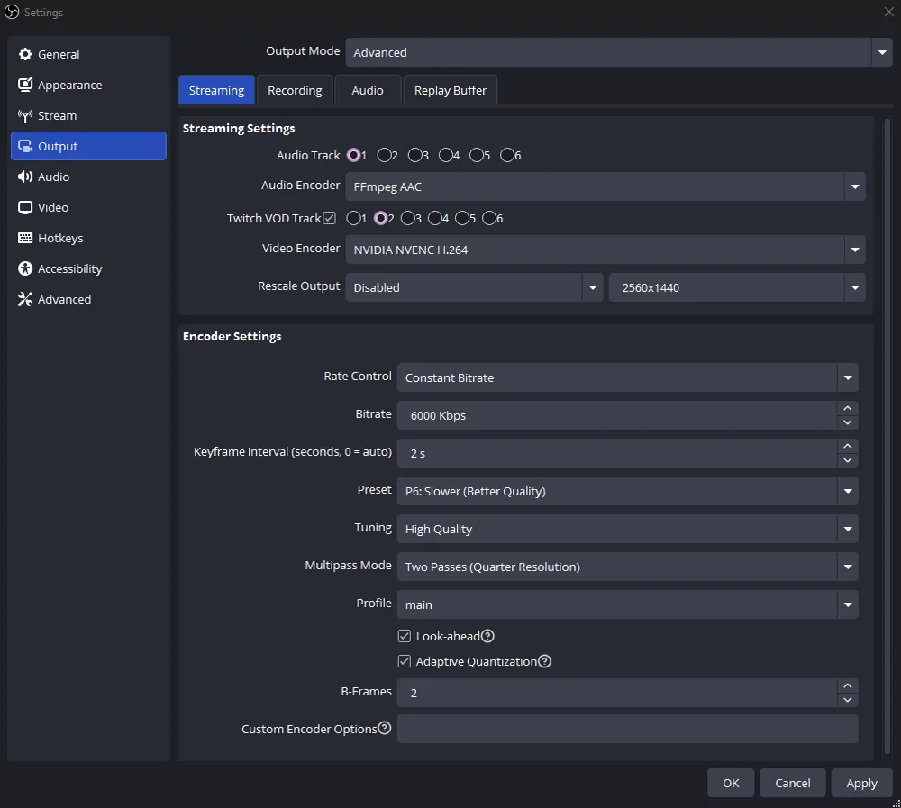 - Twitch VOD Track (Essential for 2026): Check this option and select Track 2. This allows you to stream with music on Track 1 while keeping it out of your VODs on Track 2, minimizing DMCA risks.